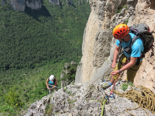 Après une journée de rando pour certains et de via ferrata pour d’autres sur le Causse de Sauveterre, suivie d’une nuit de repos, nous voici prêts pour la route vers les sommets du Causse Méjean. Casquettes, sandwiches, gourdes pleines et cordes garnissent nos sacs à dos. Le soleil illumine les falaises calcaires du Causse Méjean que nous nous apprêtons à gravir. Sous la houlette de notre guide Isabelle, nous empruntons le sentier Brunet. D’abord un chemin bétonné, puis en terre battue au milieu des pierres pour finir en sentier escarpé. Les langues se dessèchent ; heureusement, les pauses sont multiples. La montée n’a pas été vaine : à gauche la vallée du Tarn, à droite la vallée de la Jonte. Le paysage est grandiose, on en a plein les yeux. Un peu plus loin, en contrebas, le ravin des Echos et le rocher nommé « la Cathédrale ». Après trois heures de marche caillouteuse, le point de chute (ou plutôt de rappel) sous le Vase de Sèvres est atteint. Les encadrants installent le relais pendant que nous contemplons une jeune femme progresser sur une slackline à plus de 120 m du sol, sous le regard aiguisé des vautours et en dominant la vallée de la Jonte. Casse-croûte pour un groupe et descente en rappel pour les plus téméraires. Une douzaine de descentes en rappel plus tard, sans le moindre souci et sans peur (enfin, presque), nous entamons le chemin du retour avec quelques rougeurs sur la peau, que les nuages épars n’ont pas suffi à protéger.