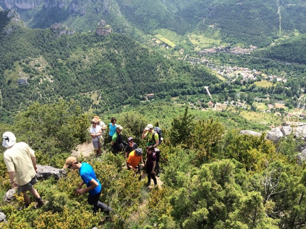 C’est en car que les ‘rangs d’honneur’ du 25 juin 2016 sont sortis d’un Clermont bien vide à 6 h 00 du matin : Out ! Direction les gorges de la Jonte. Rapidement chaussés une fois arrivés au village du Rozier, les dix-sept randonneurs se hâtent vers le premier chemin, pris en charge par six encadrants : Thierry, Maurice, Jacques, Stéphane, Christophe et Didier, qui établissent deux groupes de marcheurs.