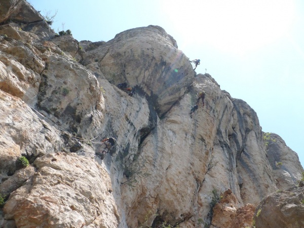 Finalement, Bernard et Isabelle s'étant mis d'accord, le groupe se dirige vers le départ de la via ferrata. Un repas rapide à 11 h, et la troupe s’équipe du harnachement nécessaire : un baudrier, une longe de via ferrata pourvue d'un amortisseur de choc… qui ne diminue en rien notre saisissement devant la beauté du lieu : une corniche somptueuse dentelée de belles cheminées calcaires qualifiées de ruiniformes.