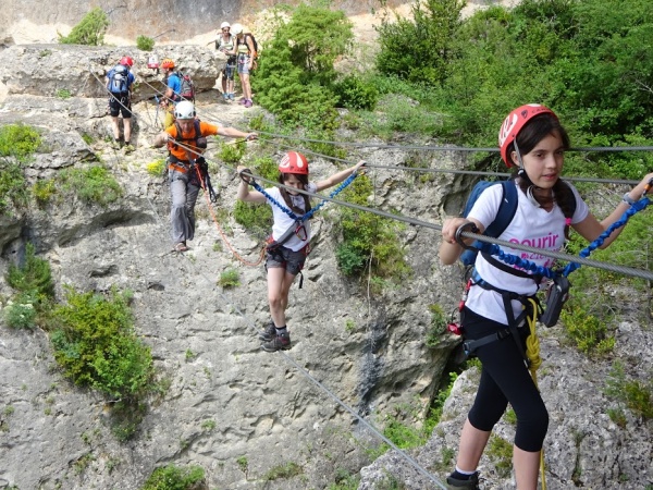 La terre sauve est là-haut. L’assaut, c’est maintenant. Isabelle passe devant, suivie d'adultes plus ou moins expérimentés. Les enfants sont en fin de cortège, encordés avec des encadrants pour plus de sécurité. Consigne est donnée d'aller au plus simple : « le parcours bleu » ! La ligne de vie serpente le long de la corniche au travers d'un chaos rocheux. Les échelles, ponts de singes, passerelles, ponts népalais se succèdent jusqu'à un croisement : bleu à gauche, rouge à droite, et au-dessus, un panneau signalant la difficulté du parcours rouge.