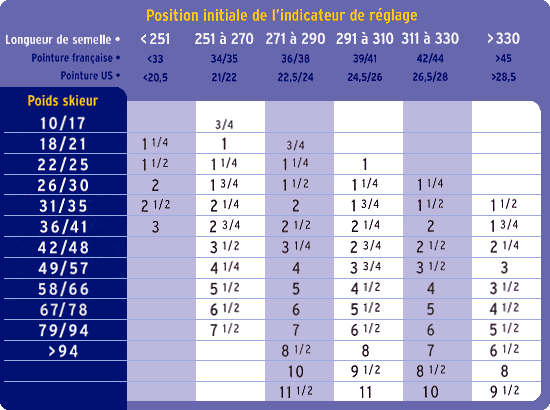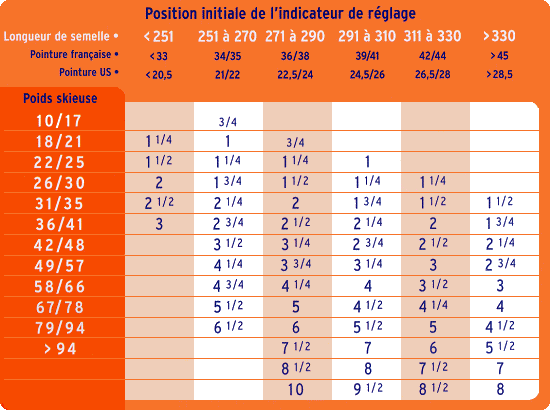 1ère étape : déterminer la position de réglage en fonction du poids et de la longueur de la semelle