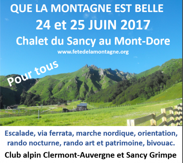 - ITINÉRAIRE DE L'ACTIVITÉ : La Fête de la Montagne - Que la Montagne est Belle aura lieu cette année dans le Massif du Sancy le week-end des 24 et 25 juin 2017 avec la participation du club Sancy Grimpe. Cet événement est destiné à faire découvrir les activités de montagne et le milieu montagnard au plus grand nombre tout en respectant notre patrimoine naturel et humain. Le camp de base sera le chalet du Sancy dans la vallée du Mont-Dore. Autour de ce camp de base, de nombreuses activités seront proposées. Il ne sera pas nécessaire de faire toutes les activités, vous pourrez vous inscrire à une ou plusieurs, c’est à la carte : Samedi 24 : - A partir de 11 h, parcours d’orientation organisé par les jeunes de l’école d’aventure. - A 10 h et 15 h, découverte de la marche nordique (deux séances de deux heures chacune). - A 14 h, via ferrata et escalade au Capucin, - A partir de 17 h, installation du bivouac à proximité du chalet du Sancy. - A 18 h, présentation des Volcans d’Auvergne, devant le Chalet - A 19 h, départ de la rando semi-nocturne dans le val de Courre, contemplation du coucher de soleil sur les crêtes du Sancy, observation des étoiles avec une longue vue astronomique et retour au bivouac avec les lampes frontales (environ 6 km et 400 m de dénivelé positif). - A 23 h environ Bivouac. Dimanche 25 : - A 9 h, randonnée découverte Art et Patrimoine dans la vallée du Mont-Dore. Environ 8 à 10 km. - et peut-être découverte du trail,… L’ensemble de ces activités est accompagné par des initiateurs bénévoles. Inscriptions obligatoires en ligne à partir du 1er juin ou renseignements Inscriptions à la permanence du club les jeudis 8,15 et 22 juin de 18 h 30 à 19 h 30 à l'adresse suivante ; 21 rue Jean Richepin 63000 Clermont-Ferrand Salle n° 1 http://www.fetedelamontagne.org / Contact organisation : 06 76 70 36 53 Hébergement et restauration : vous avez la possibilité d’utiliser les services du Chalet du Sancy. Venez dormir en famille au cœur de la montagne ! Profitez-en, la nuitée dans les refuges et chalets Fédération française des clubs alpins et de montagne (FFCAM) est à 1 € le samedi 24 juin pour les moins de 18 ans (obligatoirement accompagnés d'un adulte). Sébastien est là pour vous accueillir, informations et réservations par téléphone (04 73 22 34 81 ou 06 15 48 74 75), par courriel chaletdusancy@ffcam.fr ou sur le site du chalet http://chaletdusancy.ffcam.fr
