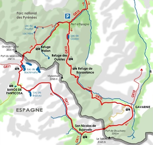 Le départ se fera depuis le pont d'Espagne au dessus de Cauterets. On remontera la splendide vallée de Gaube, puis l’on redescendra jusqu’au Cirque de Gavarnie par le GR10 côté français, avant de basculer côté Espagnol par le Port de Boucharo (2271m) où l’on remontera la Valle del Ara par le GR11, dans des paysages complètement différents. Ensuite on reviendra en France par le Port de marcadau (2541m), pour redescendre la vallée du même nom, jusqu'au Pont d’Espagne.