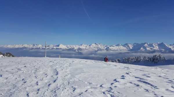 Sur le balcon des Sept Laux, vue dégagée à 360°. En route pour le Grand Rocher et sa croix, pour un panorama magnifique. Traversée du vaste haut plateau, avec d'un côté la chaîne de Chartreuse, et de l'autre, la chaîne de Belledonne...